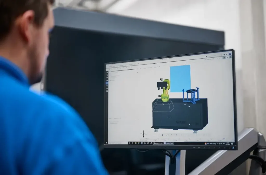 The virtual measuring room (VMR) is the central control and measurement planning software for all elements of the optical 3D measuring machine. It offers the functional representation of a real measurement environment in a virtual simulation. The VRM consists of a robot with a sensor, the programming, including the kinematics of the robot paths, the part and the measurement plan. Thanks to the VMR, the user does not need any special robot expertise. All robot movements are simulated in the virtual measuring room before execution and checked for safety.